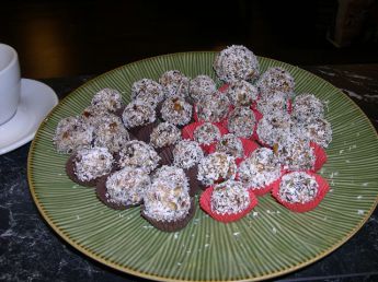 Datteln entkernen. Mit dem Blitzhacker Datteln, Feigen, Rosinen, Walnüsse und Ingwer fein hacken. Alles in eine Schüssel geben und mit Honig und Sesam, Salz, einem Spritzer Zitronensaft und Kakaopulver vermischen. Kokosraspeln in eine kleine Schüssel geben. Mit feuchten Händen aus der Masse kleine Kugerln formen und diese in den Kokosraspeln wälzen.